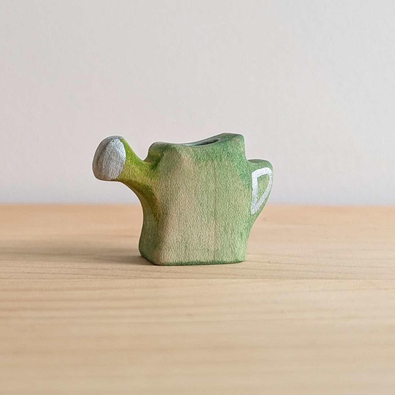 Hand-carved from solid maple and finished by hand, this wooden toy watering can has a small hole drilled that is perfect for tiny flowers. The simple shape makes it easy for little hands to hold as they care for their imaginary garden.